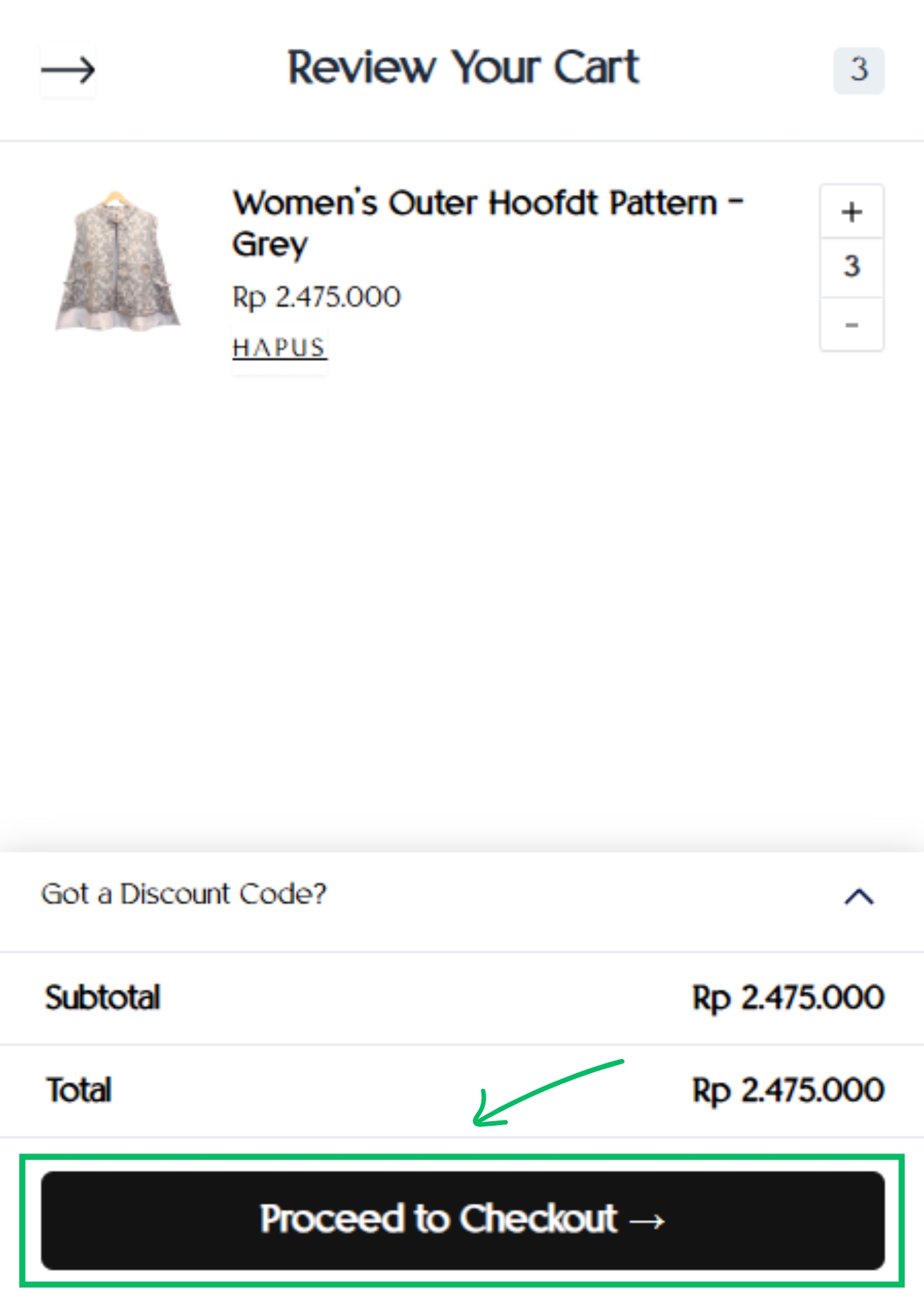 Pada halaman Cart, pastikan produk, jumlah, dan total harga sudah sesuai.