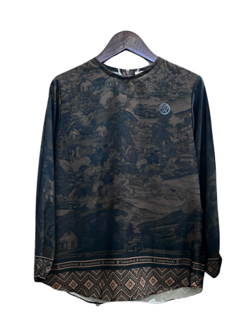 Crafted from premium Polyester Silk, this blouse presents a smooth, refined texture with a graceful drape and elegant sheen. The black and brown tones combined with ethnic pattern accents create a timeless harmony — exuding sophistication and cultural pride in every detail.