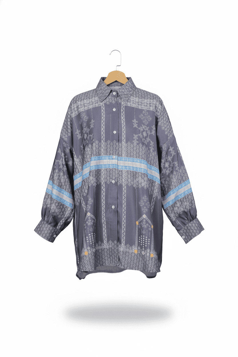 Crafted in an oversize cut, this shirt offers a relaxed structure that falls naturally on the body, creating effortless style suitable for modern fashion needs. It provides comfort and graceful movement, making it ideal for both casual settings and more polished occasions. The grey color enhances the design’s sophistication—soft, calming, and universally flattering—allowing the detailed pattern to shine subtly and beautifully.